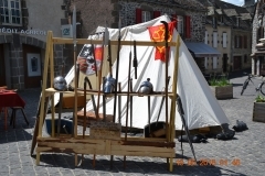 Une tente a été dressée sur la place Tyssandier d’Escous ou nos dames s’affairaient aux métiers a tisser les galons aux cartes et les cordons médiévaux a la Lucette. Une autre tente se trouvait sur la place de l’église. C’était celle des chevaliers avec un râtelier d’arme et des équipements divers (casques, gambisons, ecus….). Alors que certains membres répondaient aux questions des visiteurs et expliquaient l’utilisation des matériels, d’autres déambulaient et animaient les rues de la cité.